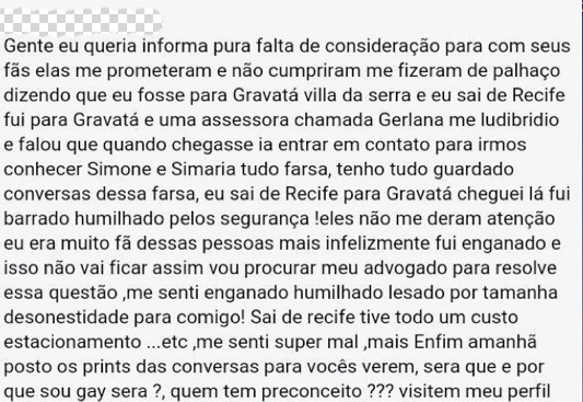 Dois fãs do Recife entraram com ação na Justiça contra Simone e Simaria dizendo que foram enganados por elas e pela assessoria da dupla.